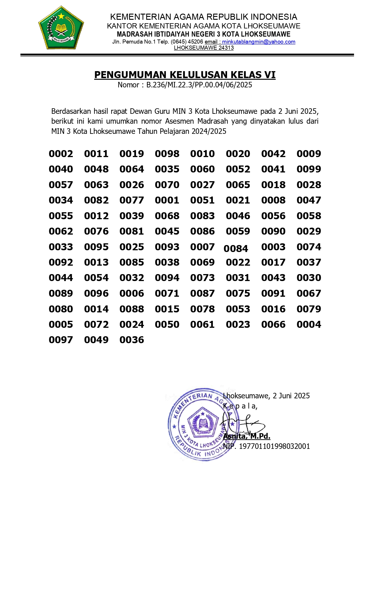 Berdasarkan hasil rapat Dewan Guru MIN 3 Kota Lhokseumawe pada 2 Juni 2025, berikut ini kami umumkan nomor Asesmen Madrasah yang dinyatakan LULUS dari MIN 3 Kota Lhokseumawe Tahun Pelajaran 2024/2025.